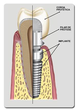 O implante dentário é um pequeno cilindro em titânio e com roscas externas. Ele possui em uma de suas extremidades conexões que permitem a instalação de próteses dentárias sobre os mesmos. Tais próteses podem ser parafusadas ou cimentadas. Além de poderem ser unitárias ou múltiplas.